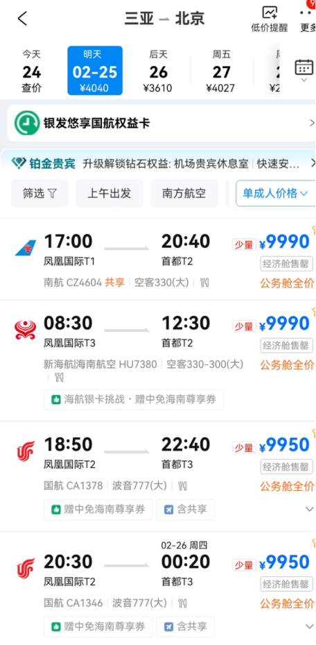 春节期间,“三亚飞北京上海机票逼近万元”等话题登上热搜。记者查询发现,2月25日,从三亚飞往北京、杭州、深圳等公务舱机票价格依旧高企,而海口前往上海、深圳还有少量经济舱机票。中国国航(601111)、中国东航(600115)、南方航空(600029)和海南航空等四大航空公司全部增加海南航班。