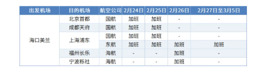 记者从海口美兰机场最新获悉,海口美兰机场联合中国国航、中国东航、海南航空再次加班。其中,中国国航增加2月24日至25日海口美兰至北京首都、海口美兰至成都天府、海口美兰至上海浦东,每日各一班;中国东航增加2月24日至3月5日海口美兰至上海浦东航班,每日一班;海南航空增加2月26日海口美兰至福州长乐、宁波栎社航班,各一班次。