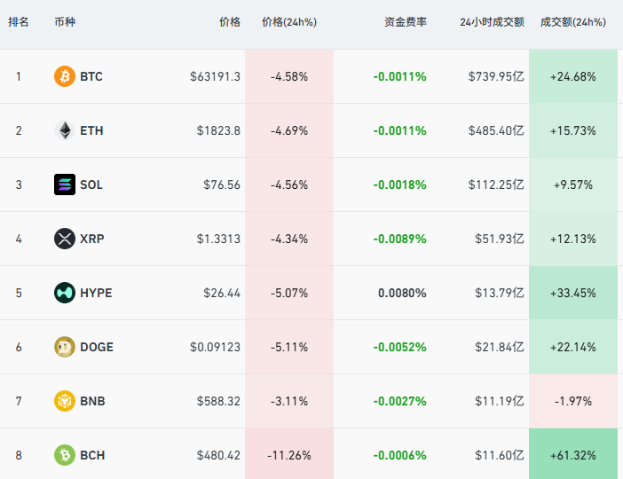 2月24日比特币延续跌势,截至18:40,24小时内跌幅超4.5%,一度失守6.3万美元重要关口。与此同时,其他主要虚拟币集体杀跌,以太坊跌近5%,失守1900美元。