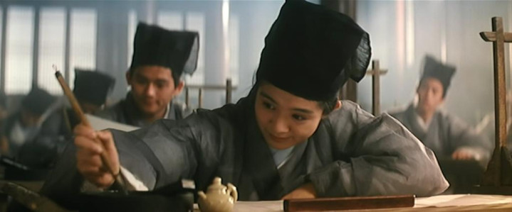为了留在学院,梁山伯只好用头悬绳的方式帮助祝英台学习,不过第二天的祝英台在考场上却是一片空白。